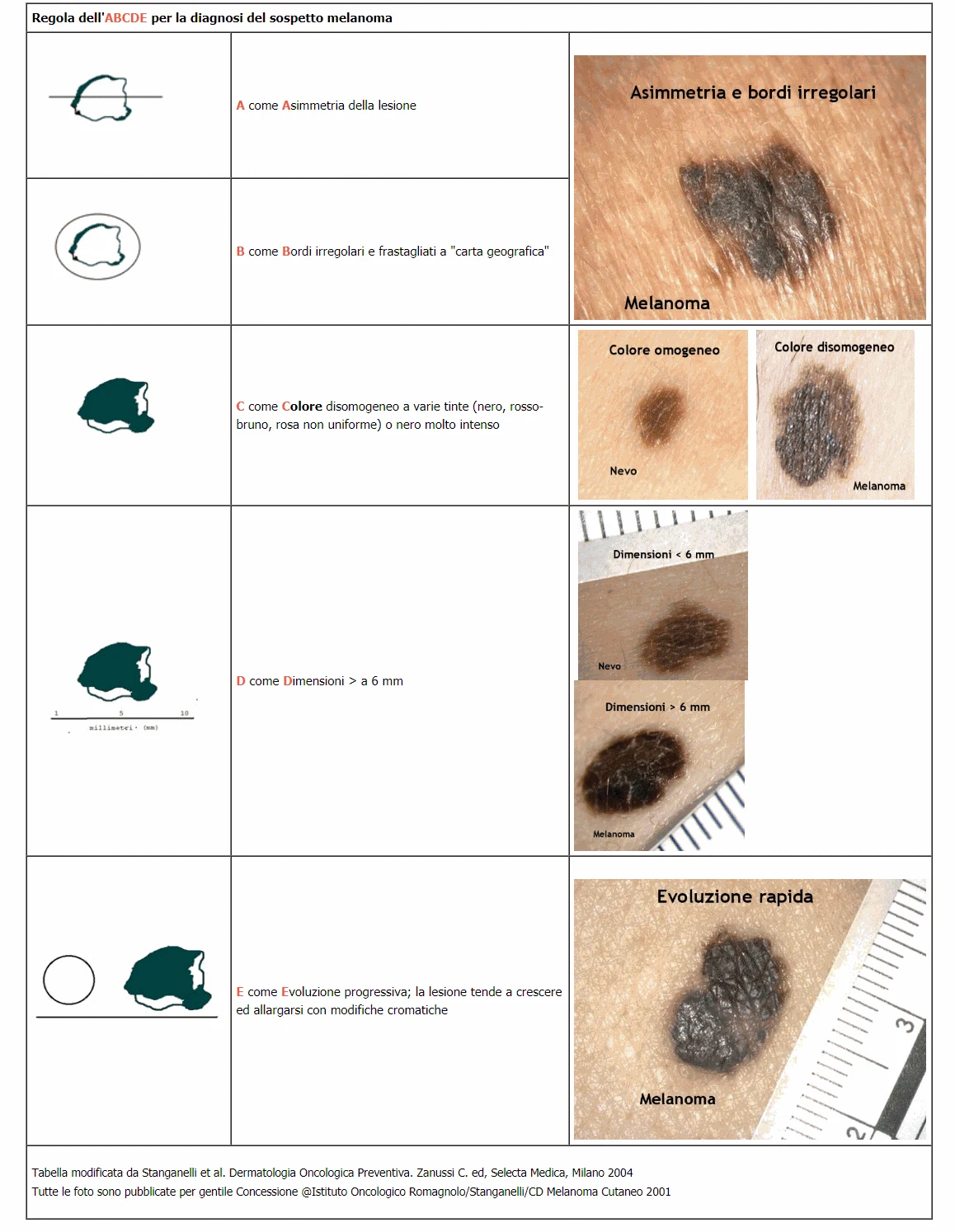 La visita generale si propone di effettuare l'identificazione clinica di un sospetto tumore della pelle maligno e di integrarsi alle metodiche strumentali non invasive presenti nel nostro ambulatorio. La prima tappa prevede l’esame visivo della pelle quale metodo di screening di base nella prevenzione secondaria (diagnosi precoce) dei tumori cutanei e in particolare del melanoma. L’esame clinico generale porta alla valutazione sia della neoformazione riferita dal paziente che di tutto l'ambito cutaneo in condizioni d’illuminazione ottimale e con l’uso di una lente d’ingrandimento. I principali indicatori clinici per l’identificazione del melanoma sono la regola dell’ABCDE e il segno del “Brutto Anatroccolo”. Da molti anni la regola dell’ABCDE (Asimmetria, Bordi irregolari, Colore disomogeneo, Dimensioni > 6 mm, Evoluzione rapida) rappresenta uno strumento didattico di riconoscimento semplice.