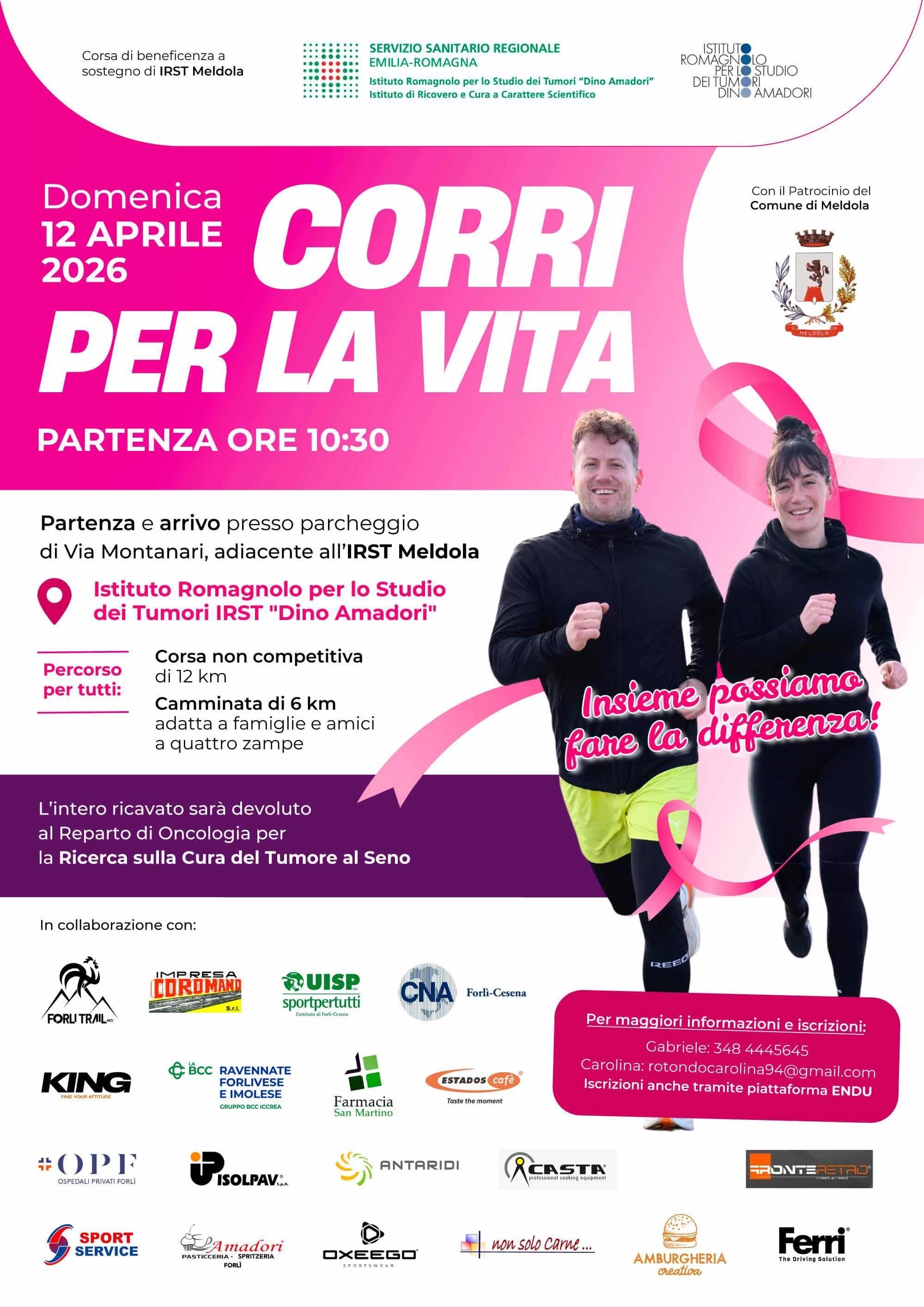 Il ritrovo è fissato domenica 12 aprile alle ore 08:30 al parcheggio di Via Montanari, davanti all'IRST "Dino Amadori" IRCCS di Meldola, che sarà anche il punto d'arrivo. La partenza è alle 10:30, con due percorsi ad anello su asfalto - da 6 o 12 km; lungo il percorso ci saranno dei punti acqua - che regalano qualche tratto in leggera salita e un bel panorama sulla città. L'evento è aperto davvero a tutti - corridori, camminatori, bambini e amici a quattro zampe sono i benvenuti – e ognuno è libero di interpretarlo secondo il proprio passo, di corsa o di camminata. Le iscrizioni online sulla piattaforma endu (cercare “corri per la vita”) chiudono mercoledì 9 aprile. Chi preferisce iscriversi di persona può farlo sabato 11 aprile presso la sede di Forlì Trail (via Noferini 2, Forlì), dove sarà già possibile ritirare la maglietta tecnica dell'evento. Le iscrizioni in loco saranno accettate fino alle ore 09:30 di domenica 12 aprile. La quota è di 15 €. A seguire l’evento, musica dal vivo e sarà presente anche un food truck, tutto per rendere la mattinata un momento di festa e condivisione.