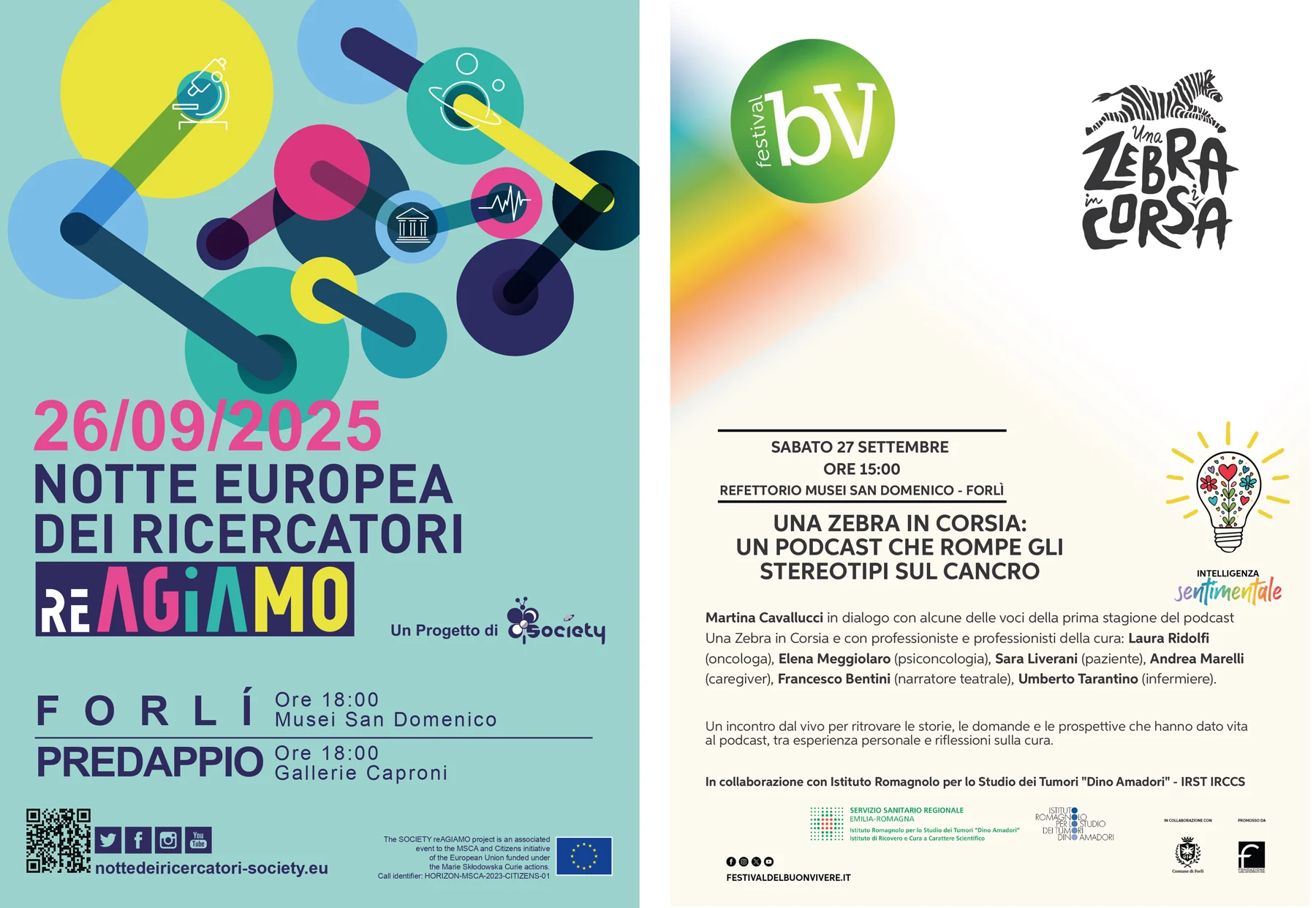 Il Festival del Buon Vivere (Forlì, 18-28 settembre 2025) compie sedici anni e quest’anno esplora il tema “Intelligenza Sentimentale”. In questo contesto si inserisce con forza la partecipazione di IRST, che porterà due appuntamenti capaci di intrecciare cultura, ricerca e impegno sociale: la Notte Europea della Ricerca e l’incontro sul podcast Una Zebra in Corsia.